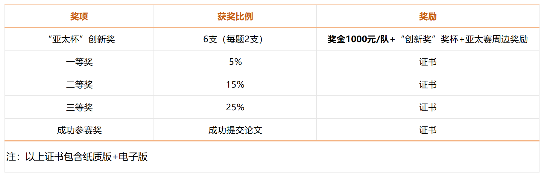 所有参赛队伍均可申请,每个奖项评选出10支队伍,获奖队伍将获得:获奖证书、电子工业出版社出版的《全国大学生数学建模竞赛指南》三本、亚太赛周边专属礼品。